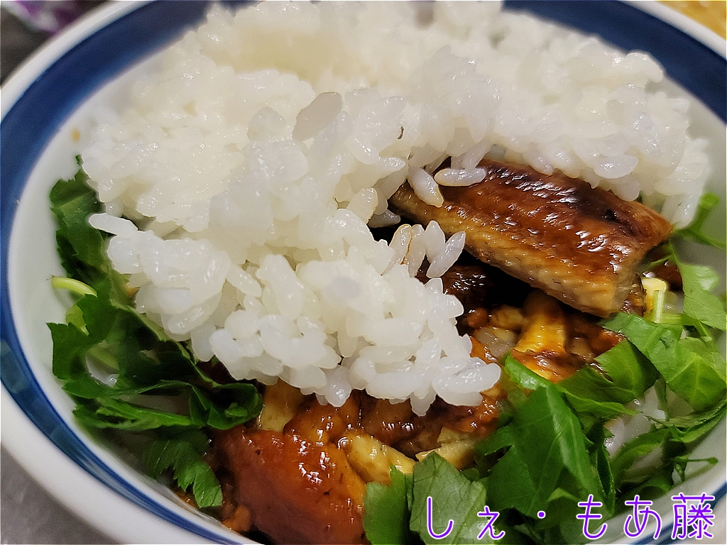 ごはんの上に鰻を敷いて、三つ葉を敷いて。